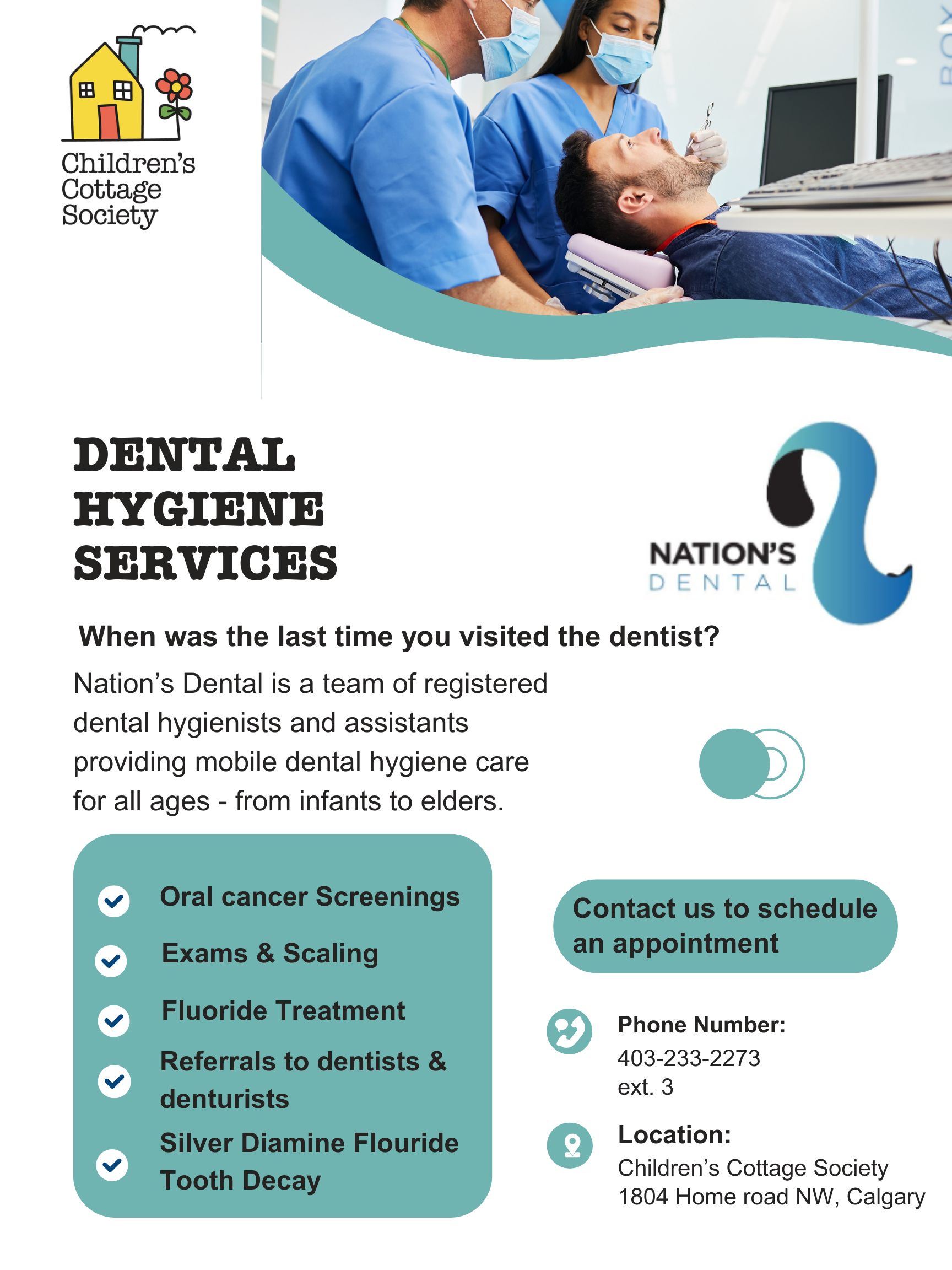 Nation’s Dental is a team of registered dental hygienists and assistants providing mobile dental hygiene care for all ages – from infants to elders.