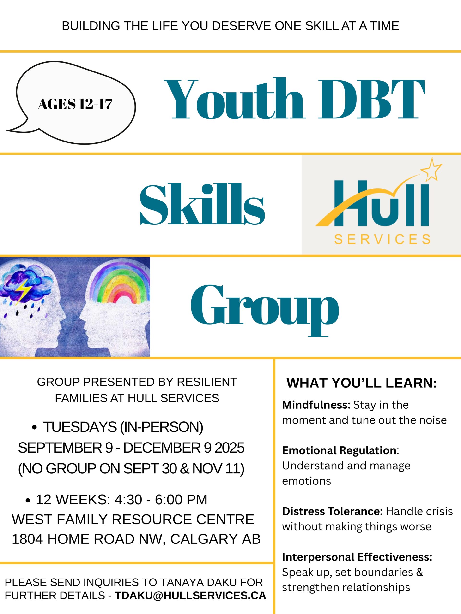 Join the Youth Dialectical Behavioural Therapy (DBT) Skills Group and tackle skills such as, mindfulness, emotional regulation, distress tolerance, and interpersonal effectiveness!