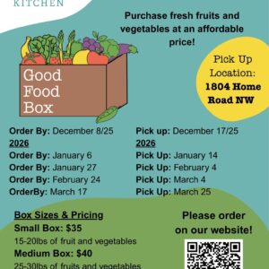This program of the Community Kitchen ensures that every Calgarian can purchase boxes of fresh fruits and vegetables at an affordable price. And now every employee, volunteer and service user at the Cottage can purchase the Good Food Box. Each Good Food Box contains a combination of fruits and vegetables. The contents vary monthly due to seasonal availability. Good Food ...